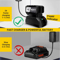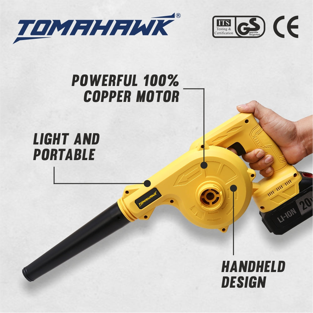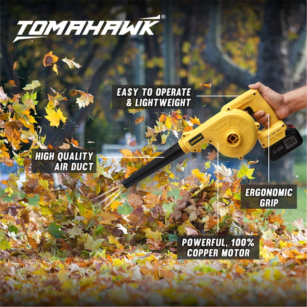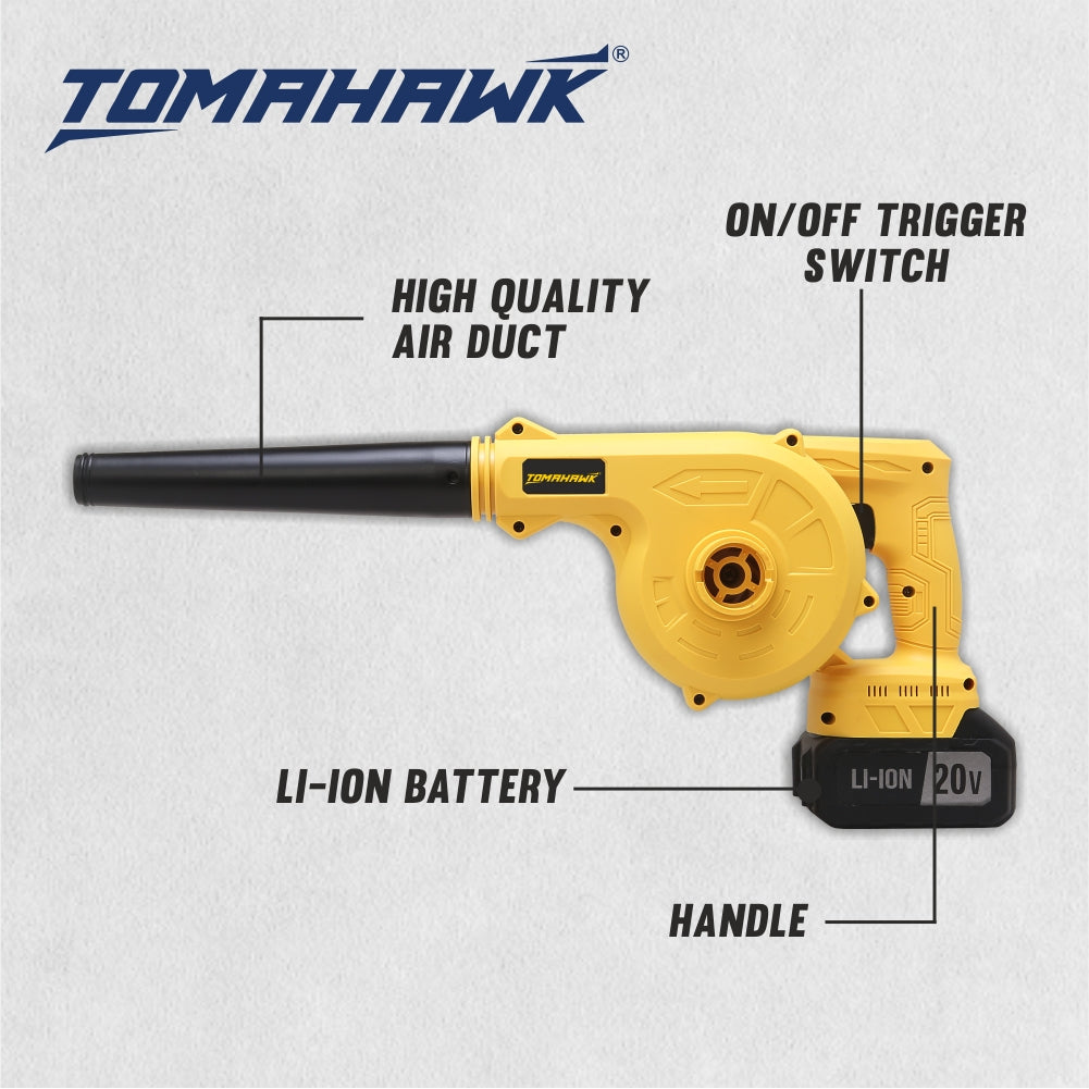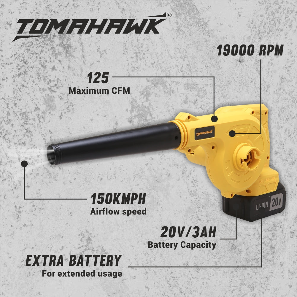 Experience high-performance cleaning with Tomahawk's TCB040, featuring a pure copper motor that achieves an airflow speed of 150 km/h and a no-load speed of 0-19,000 RPM. This blower, equipped with a 3Ah battery, offers a maximum air volume of 125 CFM for efficient operation. Enjoy customizable blowing with six variable speeds, along with the convenience of a self-lock button, fast charger, and two removable extension tubes for versatile use.