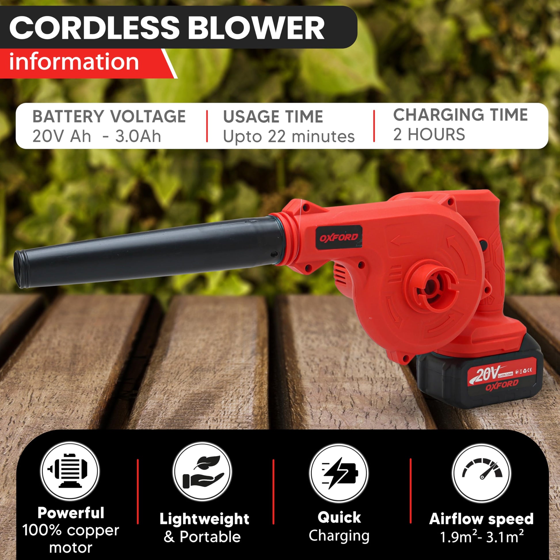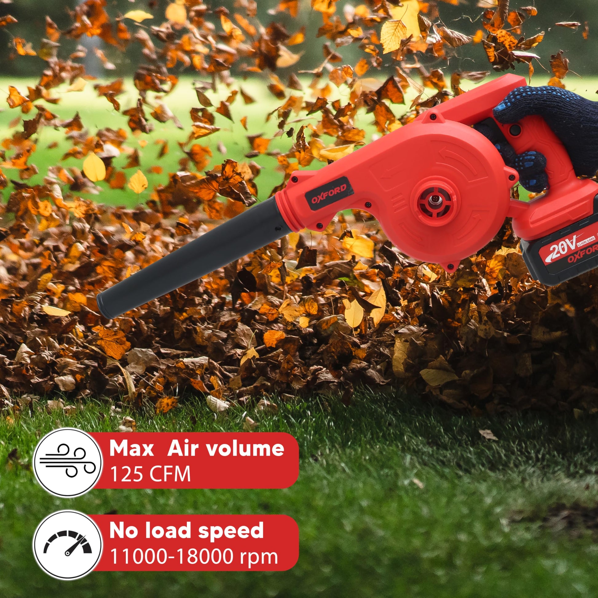 • The Oxford O-80 Cordless Blower is your ultimate solution for powerful and efficient cleaning across various settings, including home, car, garden, and office. Featuring a robust 100% copper motor, this blower can reach impressive speeds of up to 18,000 RPM, ensuring a maximum air volume of 125 CFM and an airflow speed ranging from 1.9m² to 3.1m² per minute.