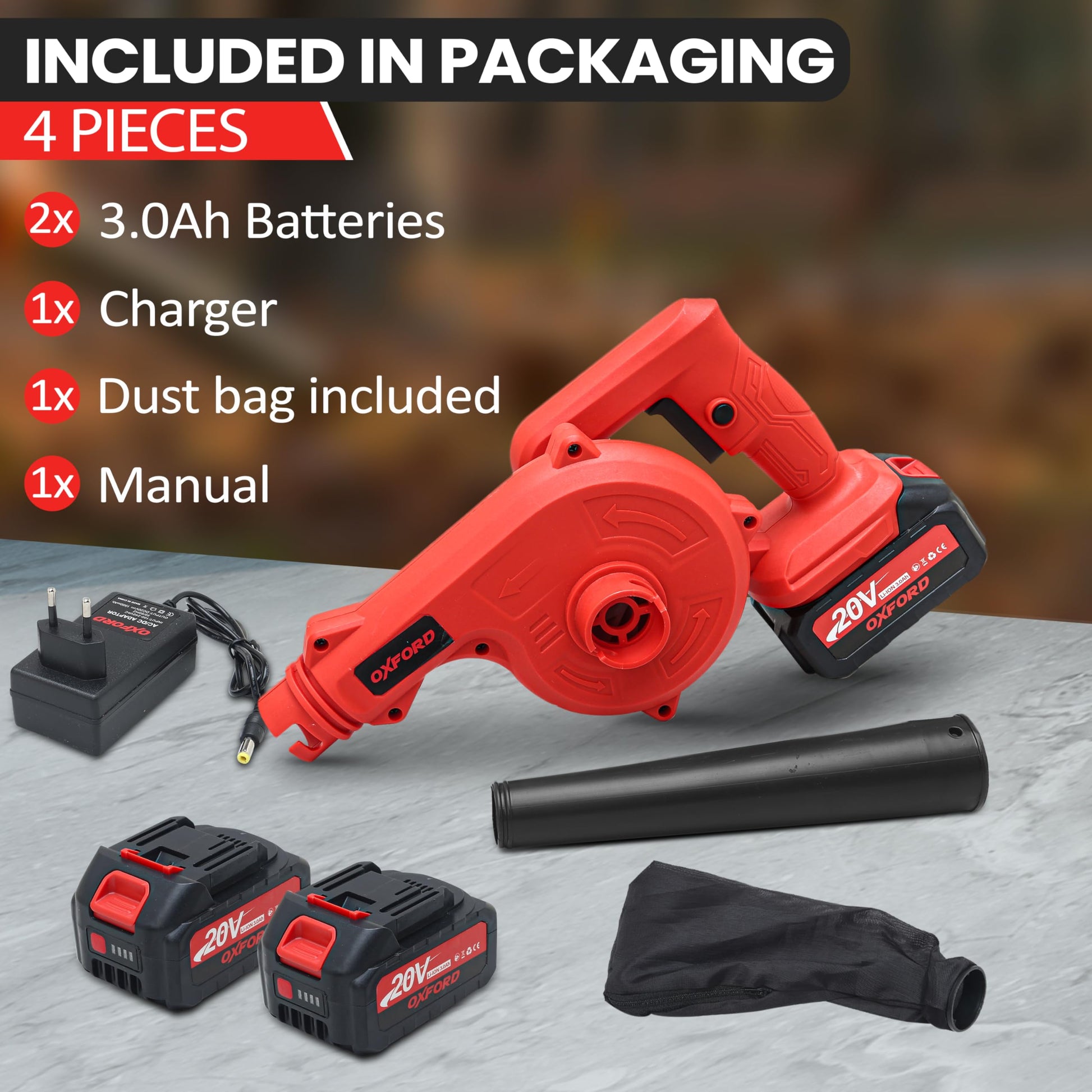 The Oxford O-80 Cordless Blower package includes everything you need for immediate use: two 3.0Ah batteries, a charger, a dust bag, and a manual. With its powerful performance, lightweight design, and comprehensive accessory package, the Oxford O-80 is the perfect tool for maintaining a clean and tidy environment in any setting.