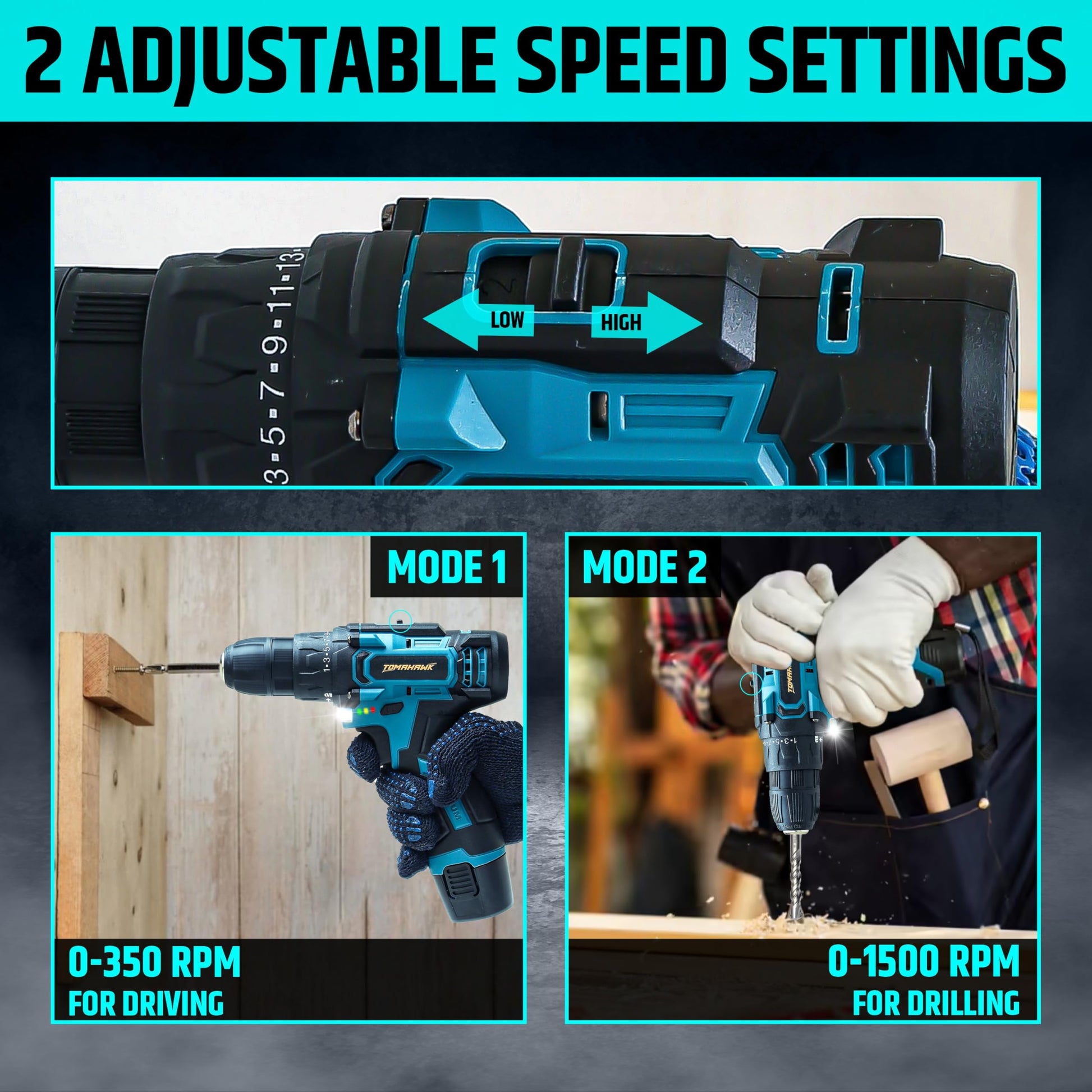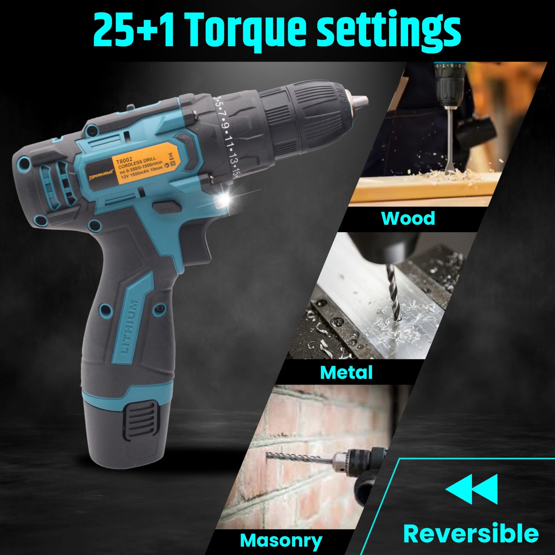 - The TOMAHAWK® Cordless Screwdriver & Drill is a powerful and versatile tool designed for DIY enthusiasts. Featuring a 12V battery with 1.5Ah capacity, this drill offers a no-load speed of 0-350/0-1500 rpm and a max torque of 30Nm, making it suitable for a variety of tasks, from screwdriving to drilling in wood & metal. With its adjustable 25+1 torque settings, you can easily adapt to different materials and ensure precision in every job. The drill's compact and lightweight design, along with a rubber grip handle, ensures comfort and control even during extended use.
