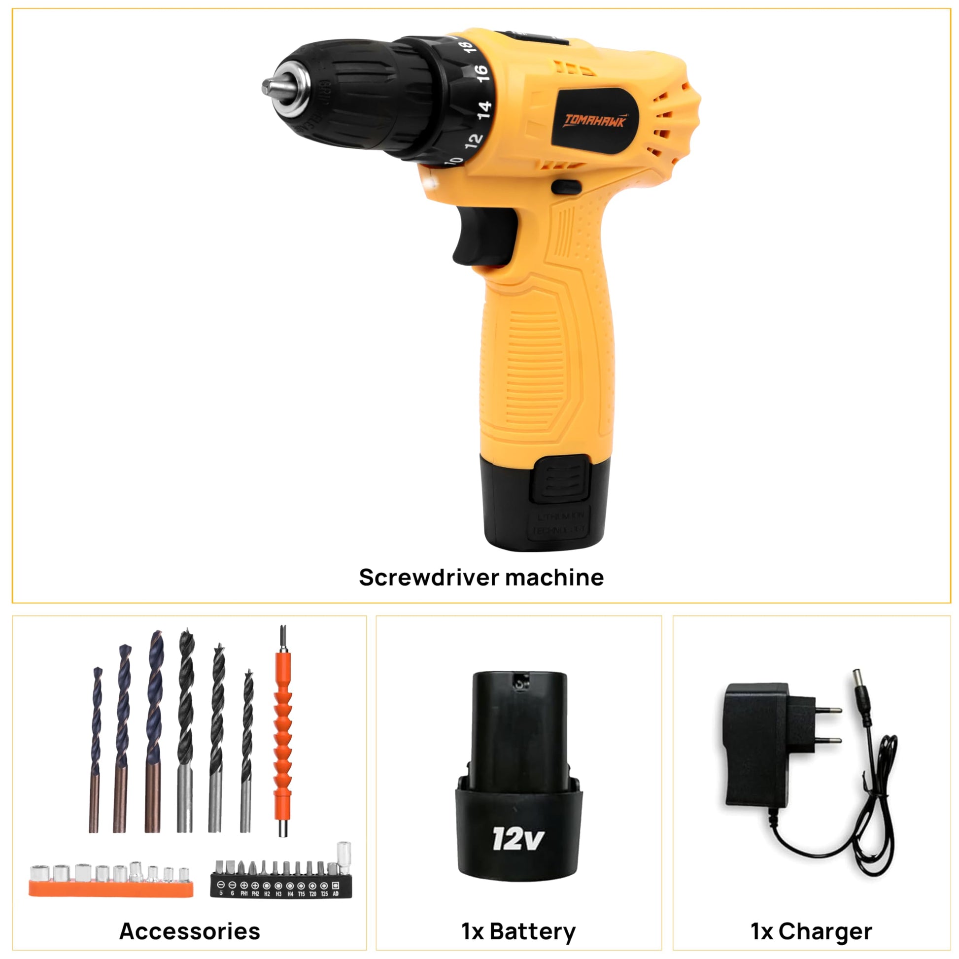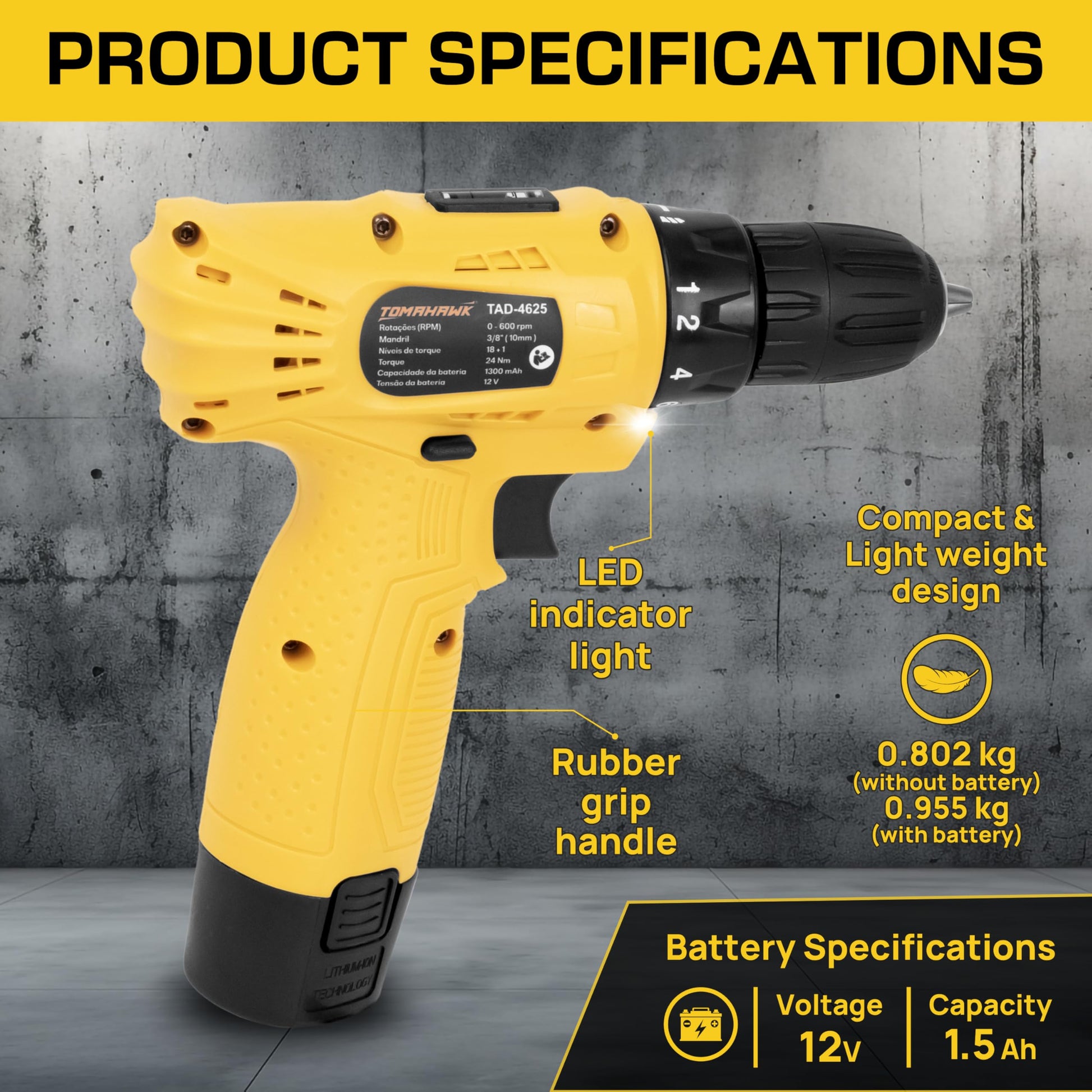 - The Tomahawk TAD-4625 12V Cordless Drill/Screwdriver combines precision, portability, and performance in one compact tool. Designed for makers, DIYers, and professionals alike, it offers 24 Nm torque and a 600 RPM motor for smooth drilling and screwdriving across multiple materials.