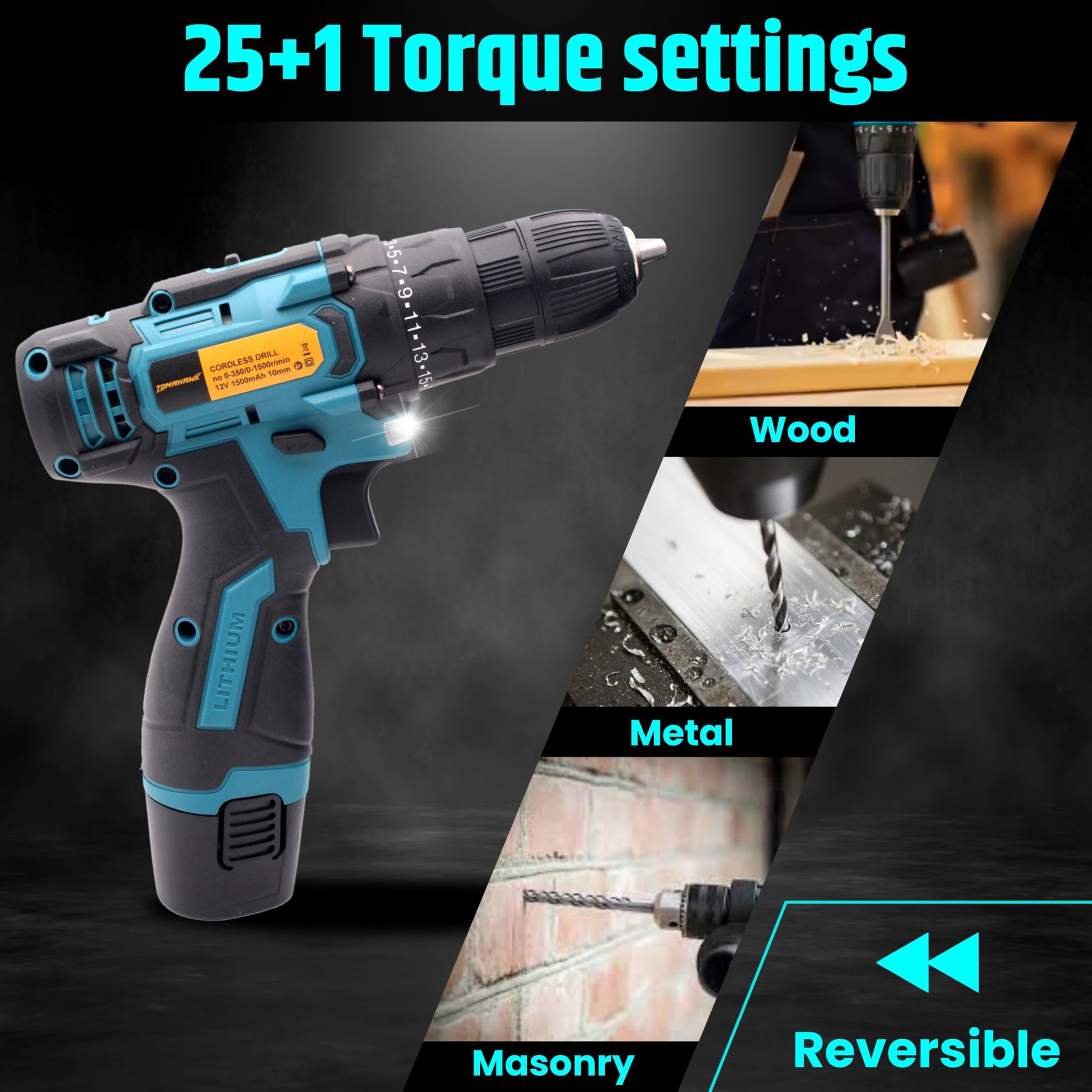 Cordless Drill/Screwdriver Kit - 12V 2-Speed Single Battery 1.5 Ah - TYS-9055