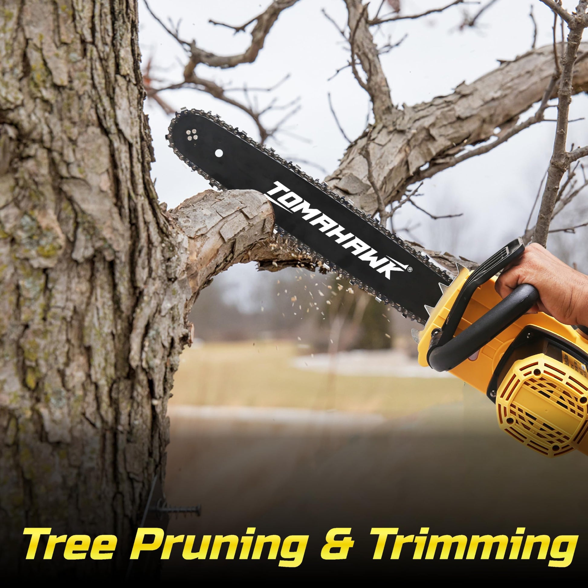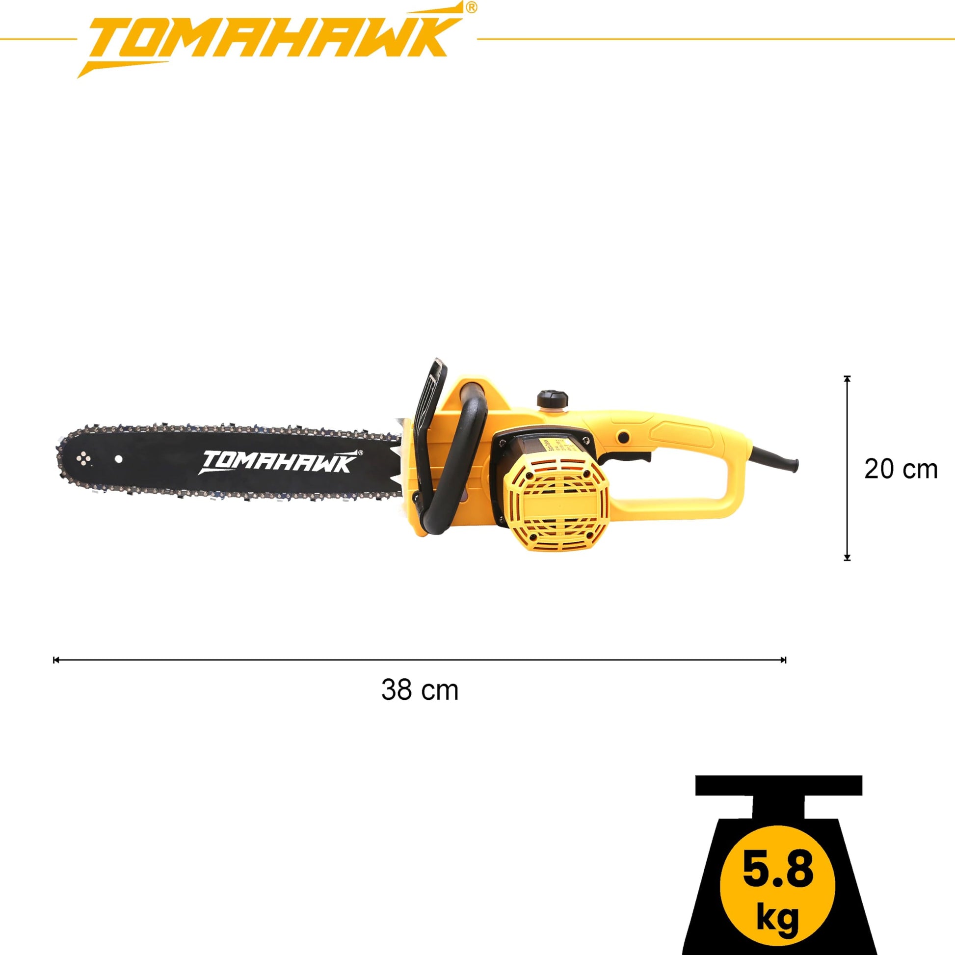 - The Tomahawk Electric Chainsaw is a high-performance cutting tool designed to tackle a wide range of tasks with precision and ease. Powered by a 1900W motor and equipped with a 16-inch guide bar, this chainsaw delivers exceptional cutting speed of 480m/min, making it perfect for tree pruning, firewood cutting, storm cleanups, and DIY woodworking projects. Its gear-driven oil pump ensures consistent chain lubrication, while the self-adaptive adjustment function provides seamless operation, even during demanding tasks. Lightweight yet durable, it weighs only 4.40kg and includes a 5-meter cord for extended reach and convenient handling.