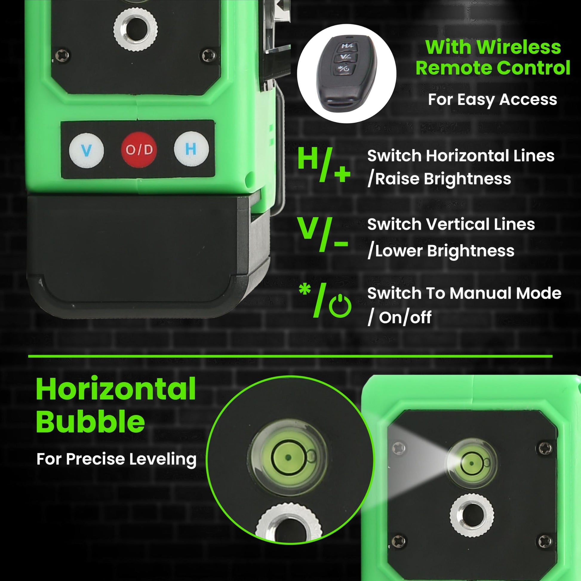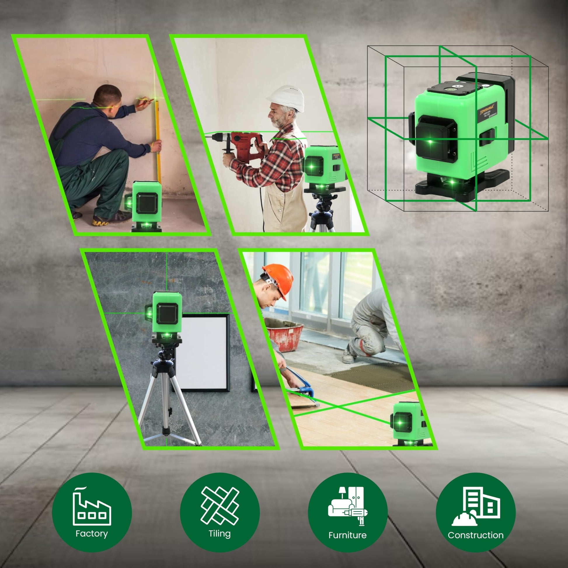 The TOMAHAWK® MLL-1200 12-Line Green Laser Level Pro is a professional-grade tool designed to provide precise and accurate leveling for all your construction, renovation, and DIY needs. Equipped with advanced 3x360° 4D laser technology, this tool projects 12 bright green laser lines, offering complete visibility for both vertical and horizontal alignment tasks. The green laser is known for its high visibility, even in bright environments, making it ideal for indoor and outdoor applications.