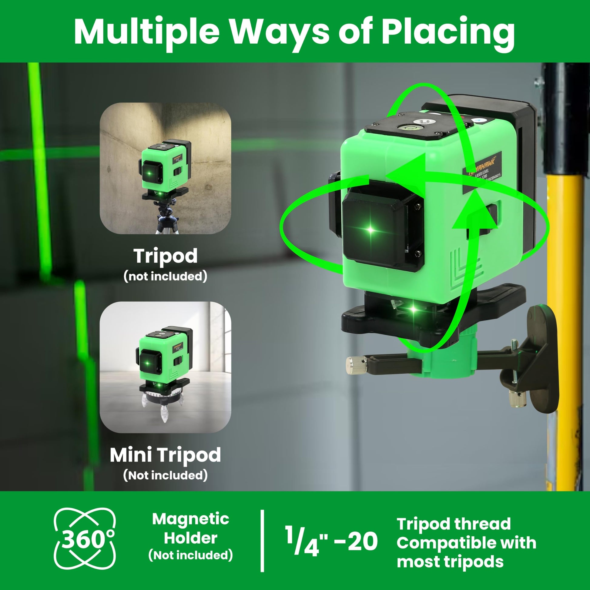 Laser Level - 12-Line Green 25m 3x360° 4D Self-Leveling Vertical/Horizontal Lasers Pulse Mode - MLL-1200
