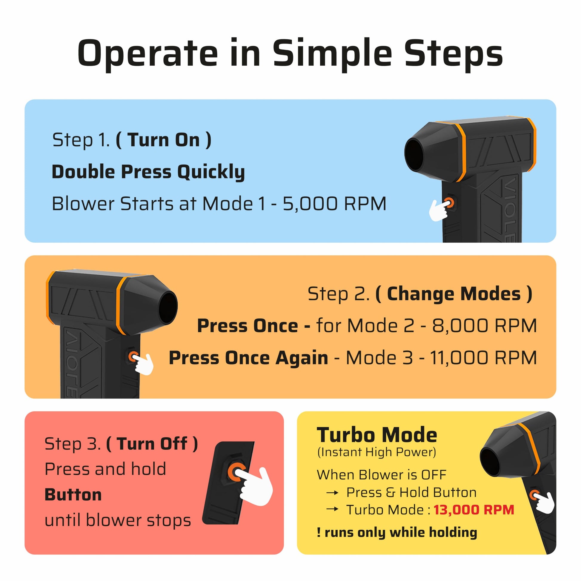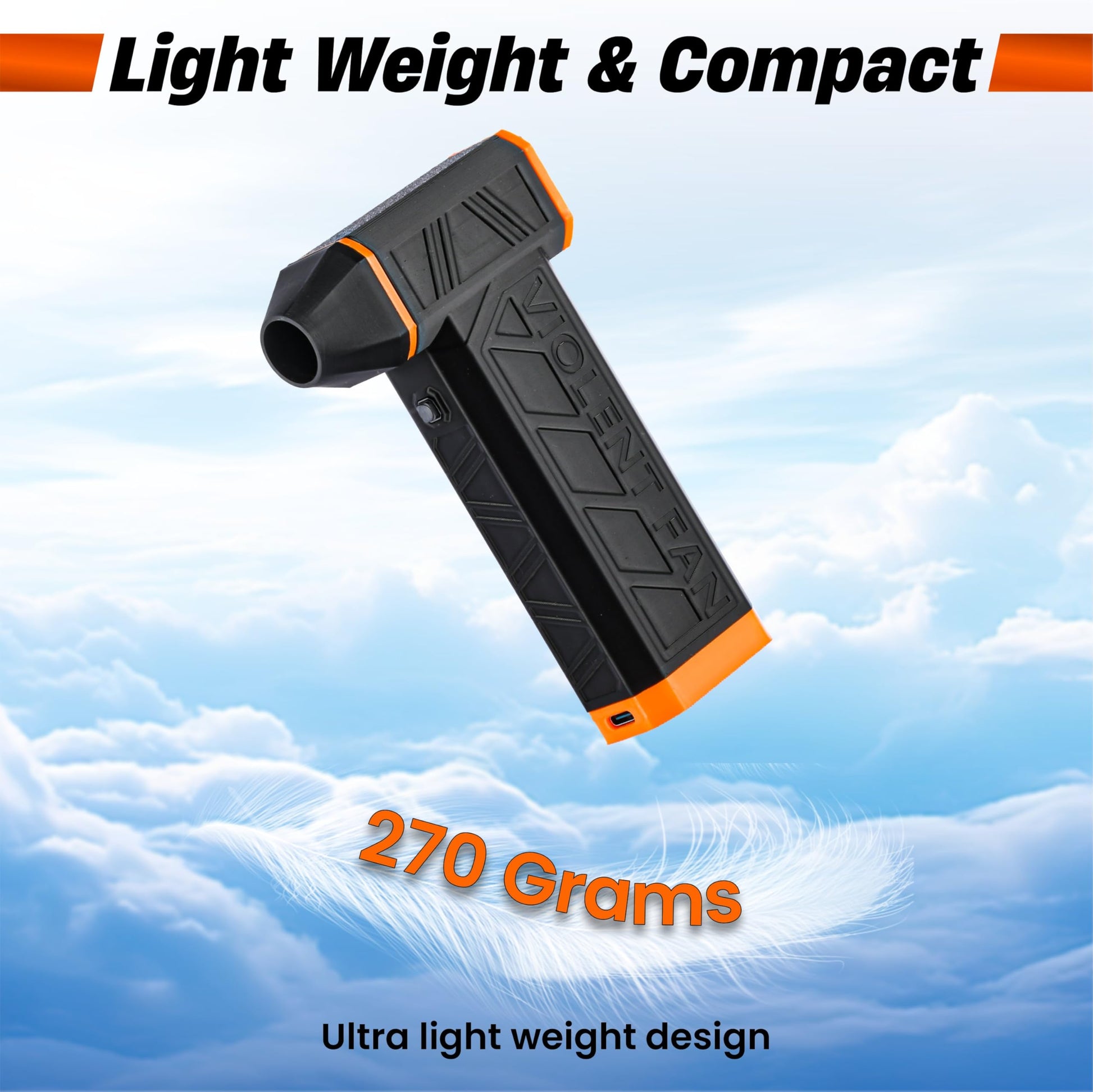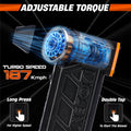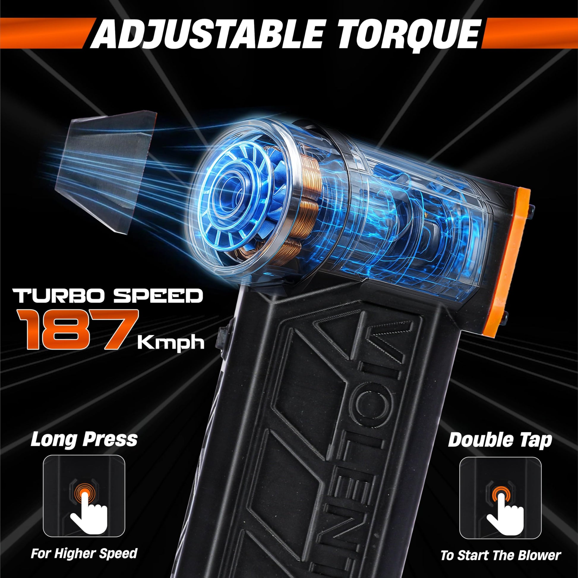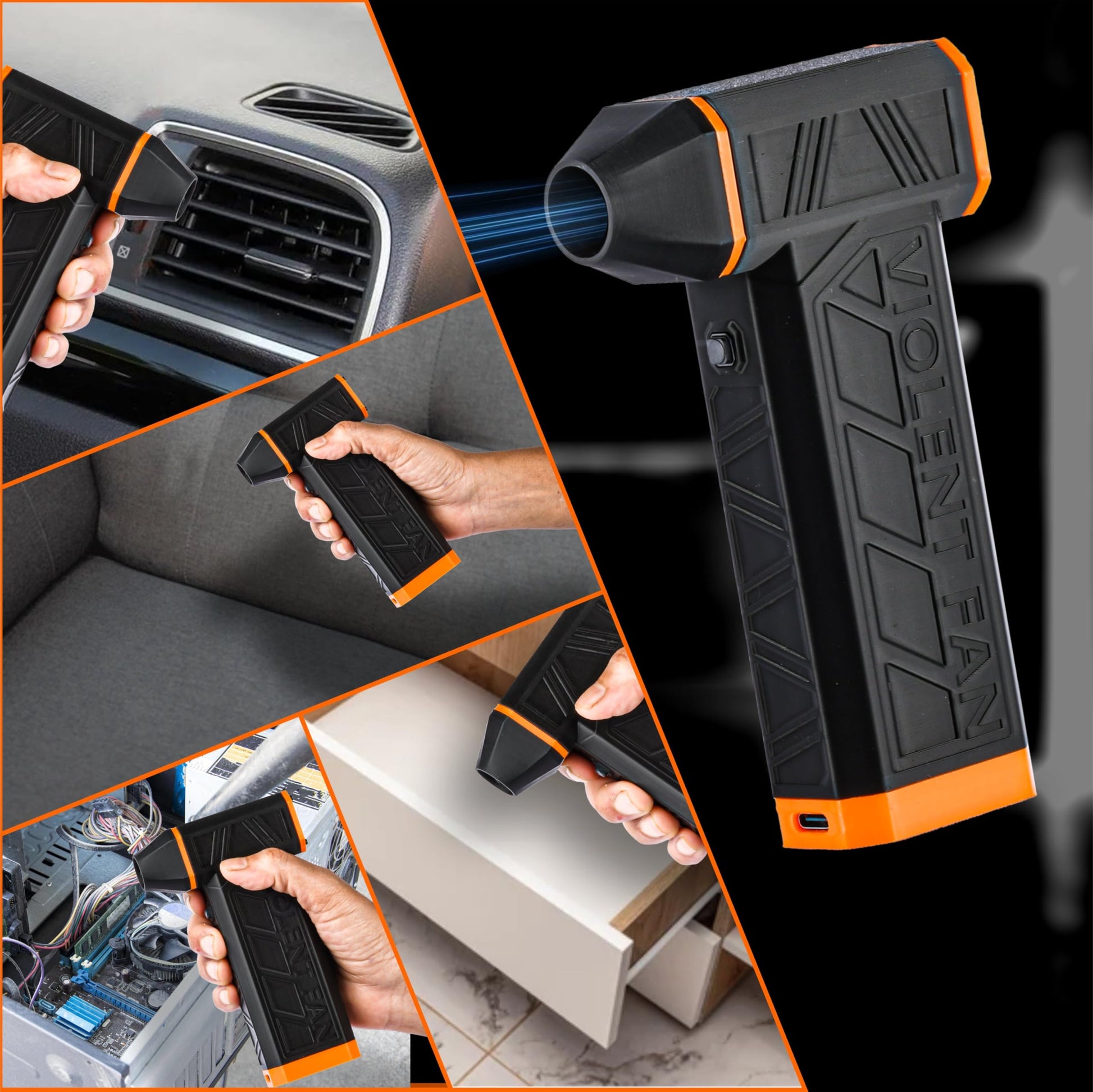 - The JET-4444 Turbojet Blower, presented by Tomahawk, is a high-performance, cordless cleaning solution designed for a variety of tasks requiring a powerful burst of air. This compact and lightweight device boasts a robust 13,000 RPM brushless motor, capable of delivering a wind speed of up to 187 km/h and a maximum wind pressure of 230 grams, ensuring efficient dust removal and thorough cleaning. Users benefit from multiple operational modes, including three distinct speed settings and a turbo mode for maximum power when needed. The device is powered by two high-quality 21700/10C batteries, totaling 8000 mAh, providing extended usage times ranging from 12 minutes in violent gear to 2 hours in gear 1. The built-in battery cutoff safety system and dual protection board with power-off protection prioritize user safety and prolong battery life. Charging is convenient and efficient via a Type-C port, supporting 13W charging. The blower's shell, constructed from 3D-printed PLA, contributes to its lightweight design. The Tomahawk JET-4444 Blower also features a user-friendly interface, with a double-tap start and a long-press for speed adjustments. Certified with GS, CE, and ROHS standards, this turbojet blower includes a USB Type-C wire and is marketed for outdoor living and cleaning applications.