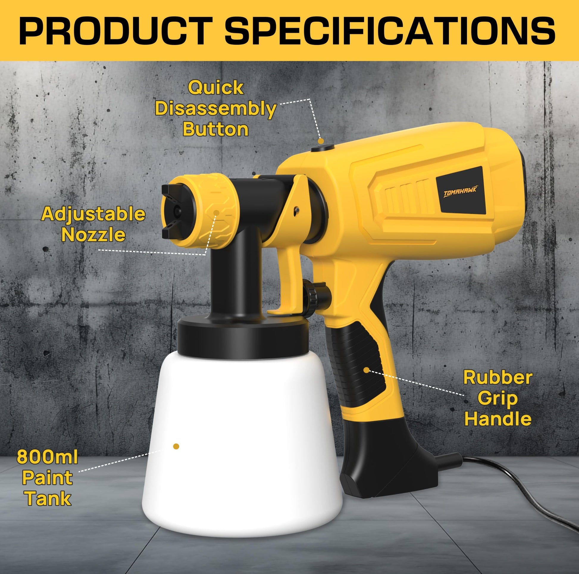 - The TOMAHAWK TPS-1200 Electric Paint Sprayer delivers powerful, efficient painting with its 600W motor and 33,000 RPM performance. Designed for walls, furniture, wood, and metal, it supports various coatings like latex, lacquer, and distemper. The 800ml tank and 800ml/min spray rate ensure quick coverage, while 3 nozzle sizes (1.0/1.8/2.5mm) offer versatility for different paint viscosities. Lightweight at 1.2kg, it's easy to use and clean. The kit includes a viscosity funnel, cleaning tools, paper funnels, and a manual. Perfect for DIYers and pros alike, achieve a smooth, professional finish on every project with this high-performance HVLP sprayer.