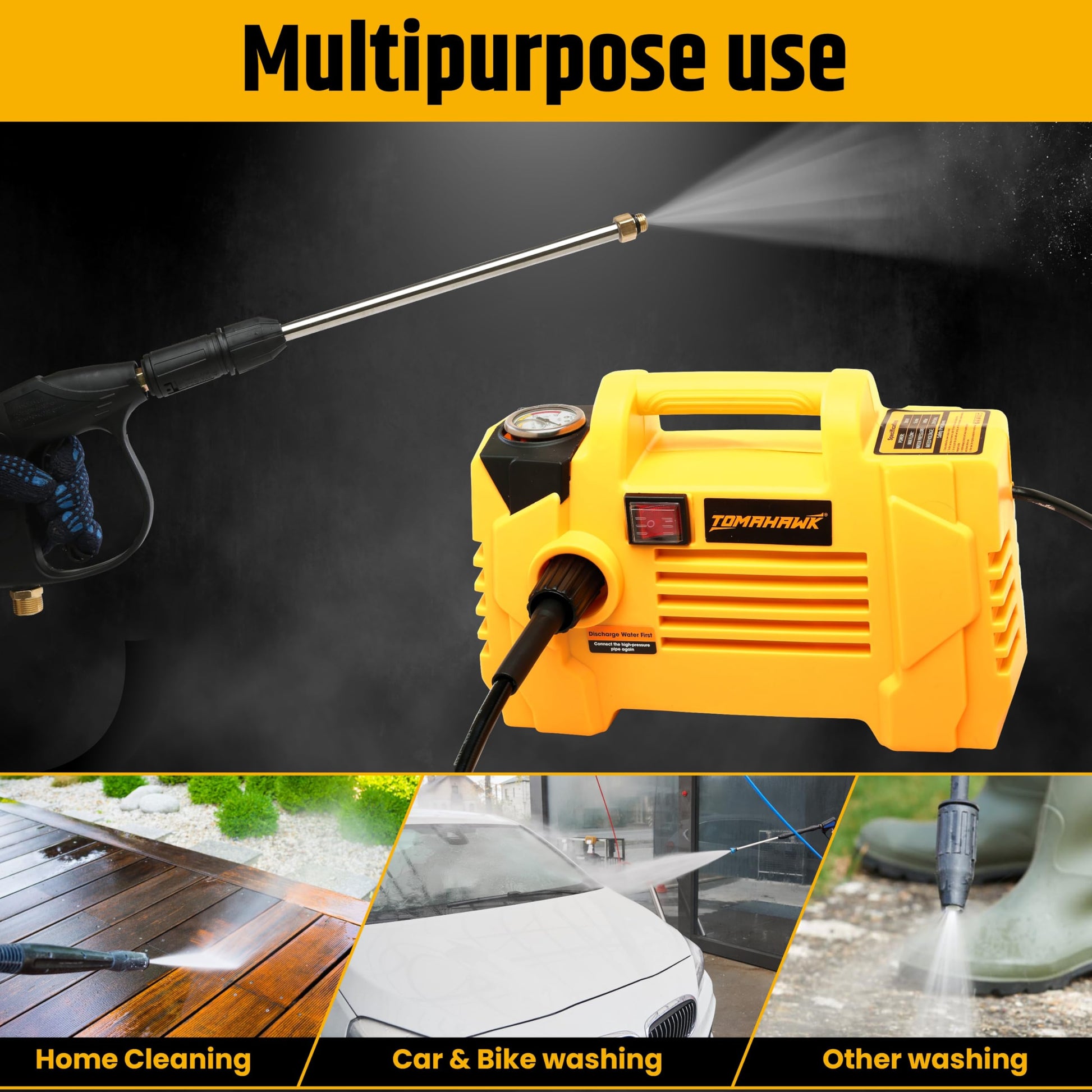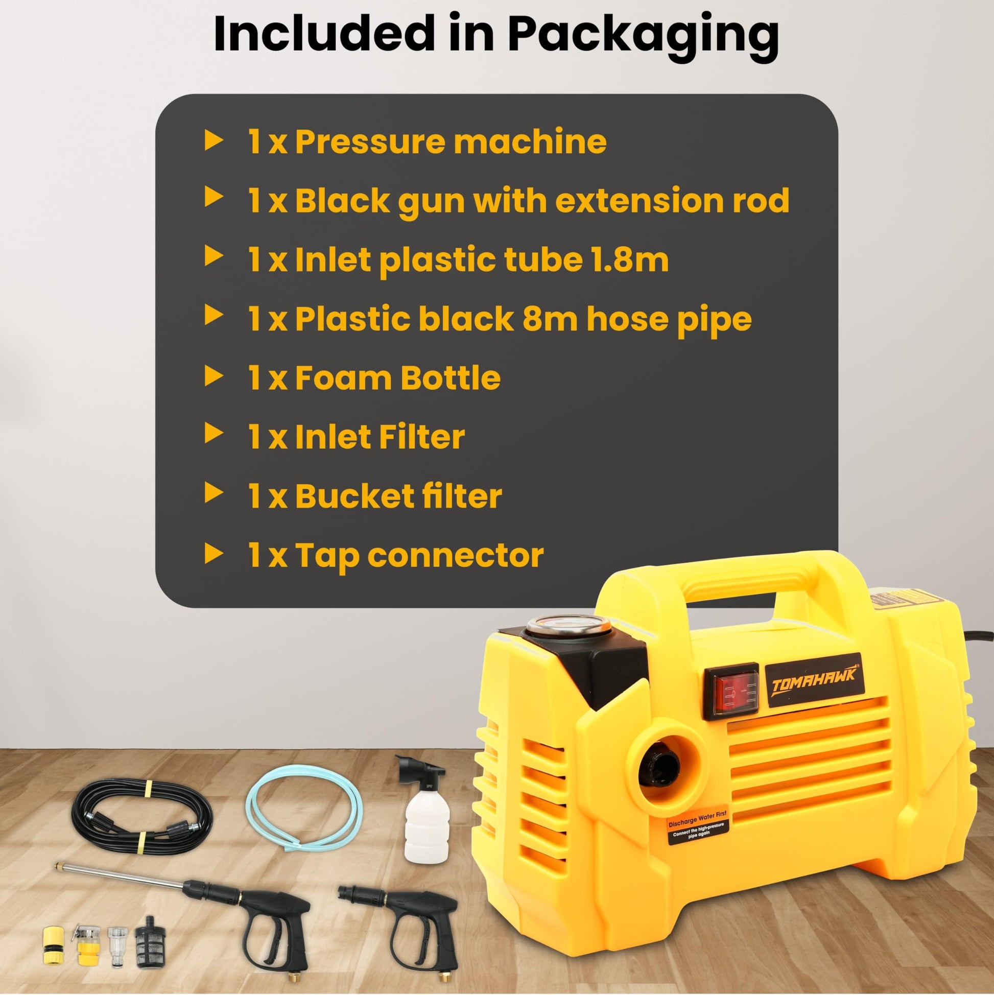 - The Tomahawk TPW 2000 Pressure Washer is a high-performance cleaning machine, designed for powerful and efficient cleaning tasks. Equipped with a 2000W motor and 100% copper armature, it delivers an impressive maximum pressure of 140 bar, ensuring you can easily tackle dirt, grime, and tough stains. The machine operates at a no-load speed of 2800rpm, and with its 5L/min maximum flow, it provides fast and effective cleaning for various surfaces. The pressure washer comes with a top-quality 8m hose pipe, allowing you to clean large areas without needing to constantly move the machine. The automatic shut-off pump ensures energy savings and prolongs the lifespan of the unit. This pressure washer is perfect for washing cars, bikes, home exteriors, and other DIY cleaning purposes. Its adjustable nozzle allows for precise control over the water flow, making it versatile for different cleaning tasks. The TPW 2000 is designed with user convenience in mind, offering features such as a 1.7m cord length and an ergonomic gun with an extension rod. Additionally, the packaging includes essential accessories like a foam bottle, inlet filter, bucket filter, and a tap connector, ensuring you have everything you need for a complete cleaning experience.