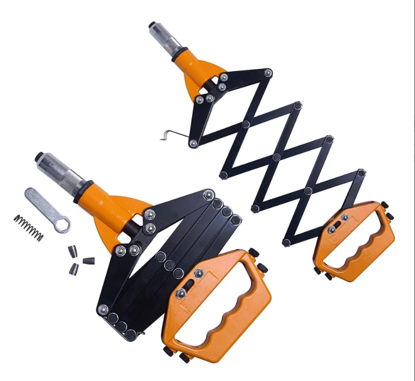 - The Tomahawk 32” Heavy-Duty Folding Riveting Gun is built for professionals and DIYers who need power, precision, and comfort in one tool. Designed with a durable foldable body, it’s easy to store and transport while offering unmatched leverage for effortless riveting. The non-slip ergonomic handle ensures a firm grip even during heavy-duty tasks. It comes equipped with interchangeable tips and a spanner, along with a free extra spring and jaw, making it a complete set for all your riveting needs on metal, plastic, or other materials. Perfect for industrial fabrication, automotive work, and home repairs.