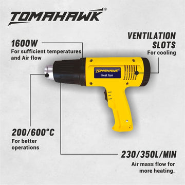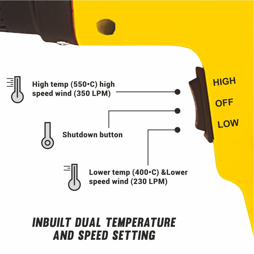 The T3200 Heat Gun, made in India, delivers 1600W of power with a 100% copper armature and field coil for durability. It features adjustable temperature settings from 200°C to 600°C and a strong airflow range of 230 LPM to 350 LPM. Ideal for versatile heat applications like stripping paint, shrink wrapping, and more.